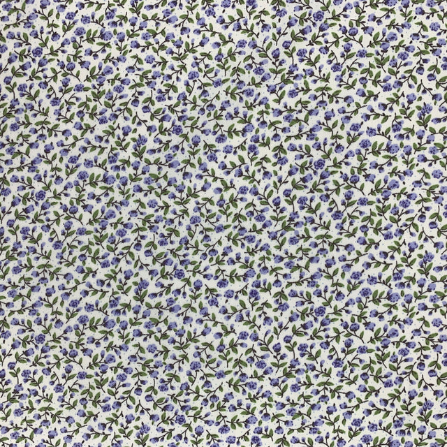 45 in (114 cm) wide new floral prints on exquisite 100% cotton Poplin. This features lilac flowers with green leaves on a cream ground. Approx 121gsm