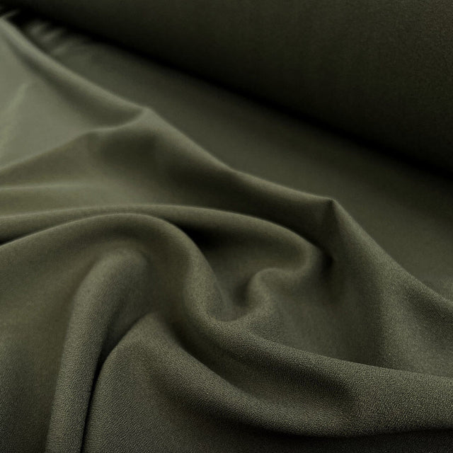 148cm wide, lightweight crepe dress fabric in khaki, made from a blend of 78% polyester, 18% viscose, and 4% spandex.