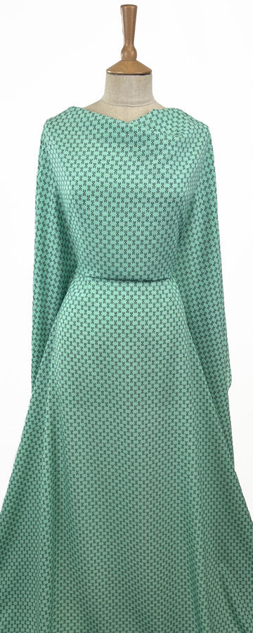 Soft polyester lightweight crepe dress fabric in aqua green with a tiny five dot motif design in black. A really good small scale design.