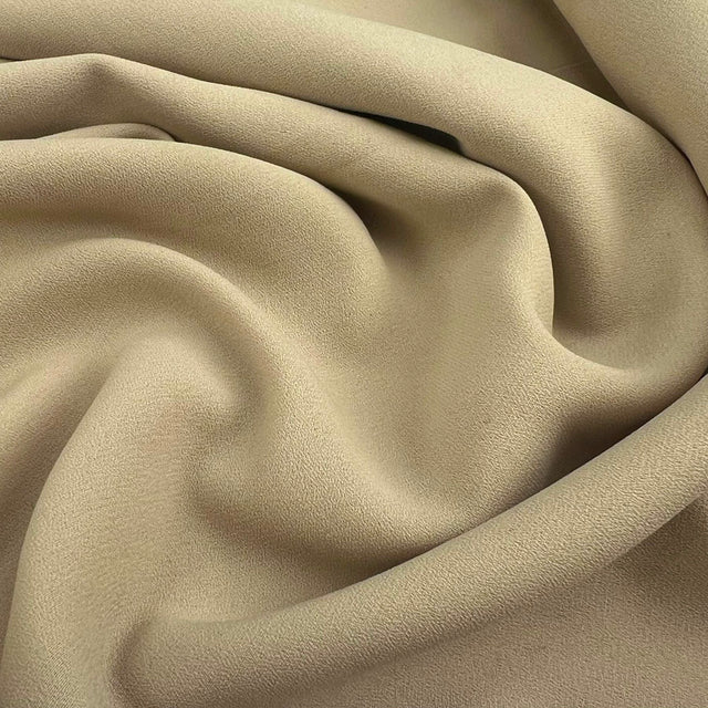 Superb quality 145cm wide double crepe dress fabric in beige, crafted from 100% polyester. A consistent best-seller, this fabric is the go-to choice for many of our dressmakers for all things bridal, special occasion, and prom. It is easy to sew, drapes beautifully and once made up, will be an easy-care garment.