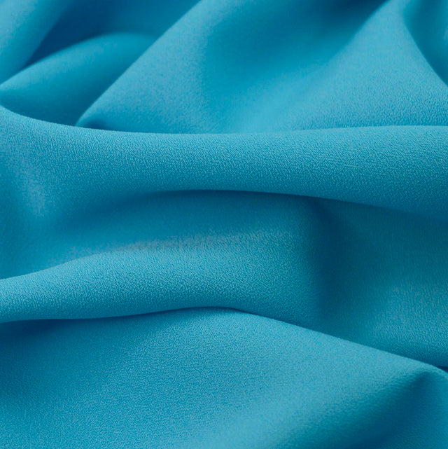 Superb double crepe dress fabric, 145cm, in turquoise. One of our best sellers, this double crepe dress material is the go-to fabric for many of our dressmakers for all things bridal, special occasion and prom. It is easy to sew, drapes beautifully and once made up will be an easy-care garment. .