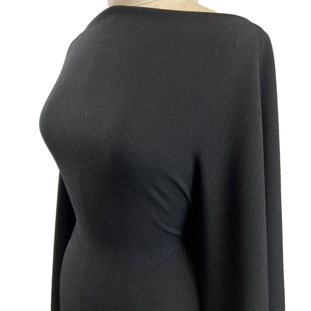 150cm wide stretch crepe in black, an excellent dress fabric, medium weight and versatile this double crepe will work for dresses, tops, jumpsuits and jackets. The 2% elastane helps for little extra comfort and recovery.