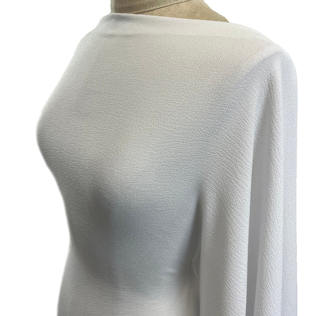 150cm wide stretch crepe in white, an excellent dress fabric, medium weight and versatile this double crepe will work for dresses, tops, jumpsuits and jackets. The 2% elastane helps for little extra comfort and recovery.