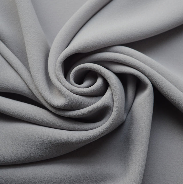 This 160cm wide exquisite triple crepe dress fabric is crafted from high-quality polyester in a silver shade. Triple crepe is renowned for its exceptional weight and drape, which give garments made with it an unparalleled elegance and sophistication.
