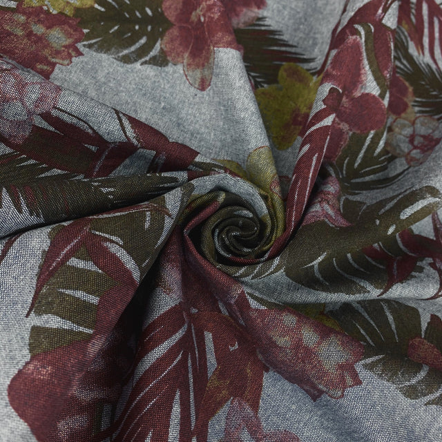 | 4oz printed cotton chambray shirting with a tropical print in a subtle colourway of ochre, dark olive, brown and rust. A nice one for a mans shirt. | |
