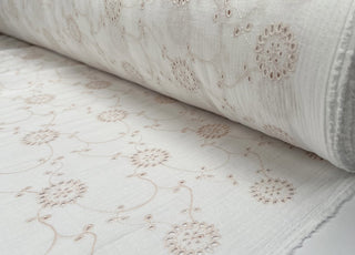 144cm wide, cotton broderie anglaise double gauze fabric in terracotta with dainty sunflower motifs.