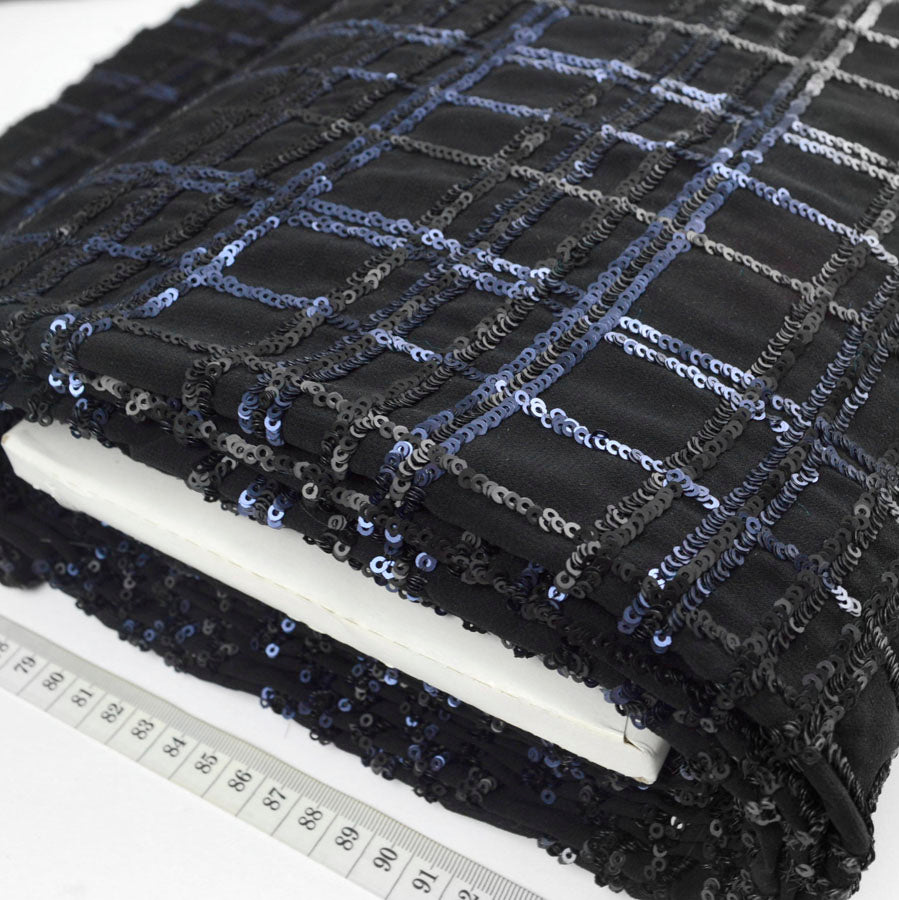 100% polyester sequinned fabric. The sequins are sewn onto a black georgette base so this moves beautifully and is perfect for a posh top.