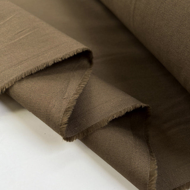 A beautifully crafted 150cm wide, lightweight 100% cotton twill trousering fabric in a rich dark sand shade, offering softness, breathability, and effortless style.