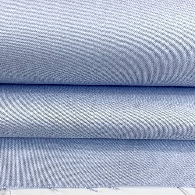 Our cool ice blue cotton fabric has a slight stretch due to its partial elastane composition. This beautiful material has an elegant sateen finish.