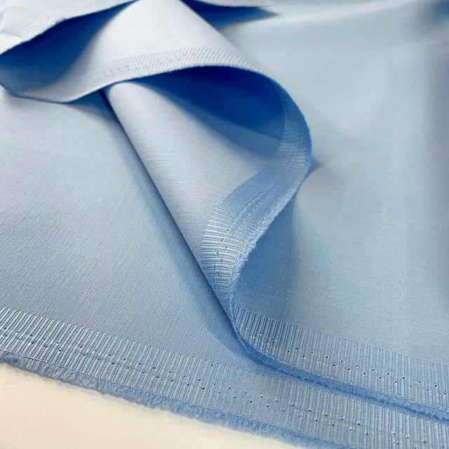 Our lovely light blue stretch cotton fabric is a delight to work with. This fabulous material has a sateen finish, perfect for making elegant garments for any occasion.