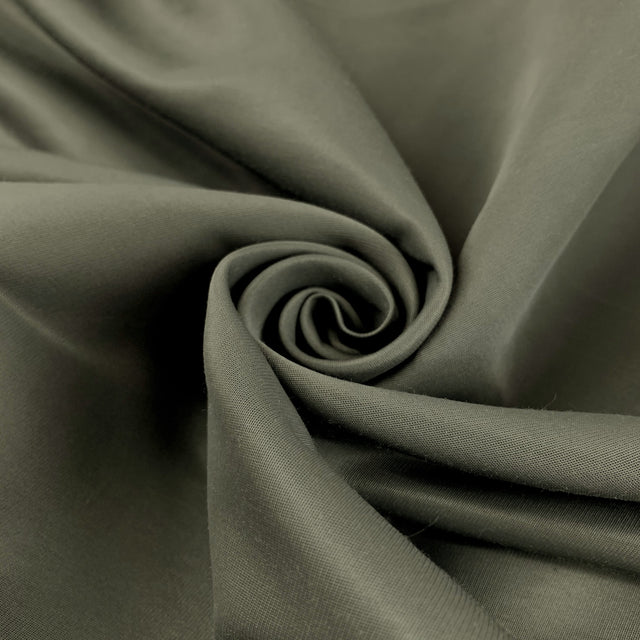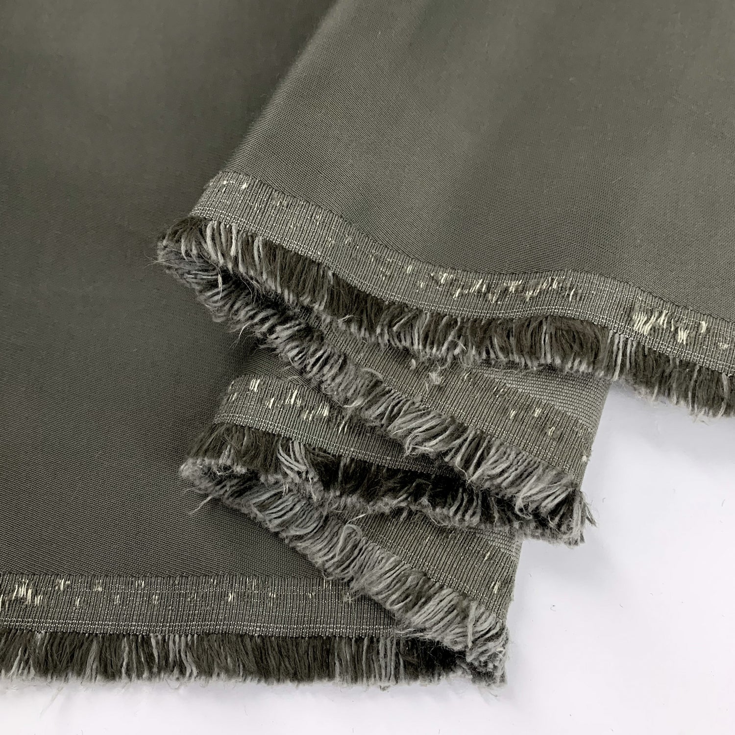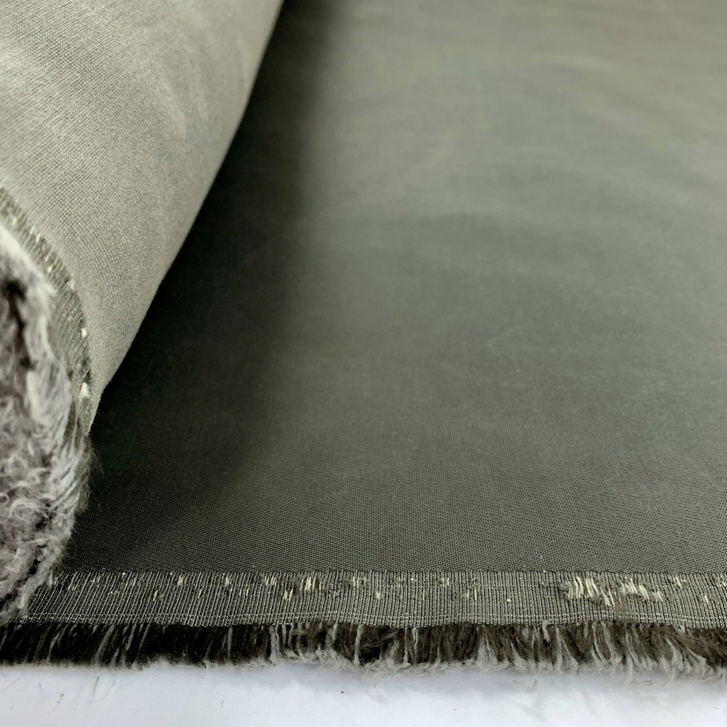 | Cotton/Nylon mix fabric in a dark Khaki colour – the face is in nylon with a lightly brushed cotton twill on the reverse. The face is a very smooth and very finely woven article which I suspect will look extremely good in the right kind of jacket, however... I suspect this may have been made for bags. A very unusual fabric. Darn good cloth form a European manufacturer. | |