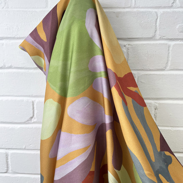 This 150cm wide, Ecovero viscose dress fabric showcases a colourful large abstract design which must have origins in the Caribbean.