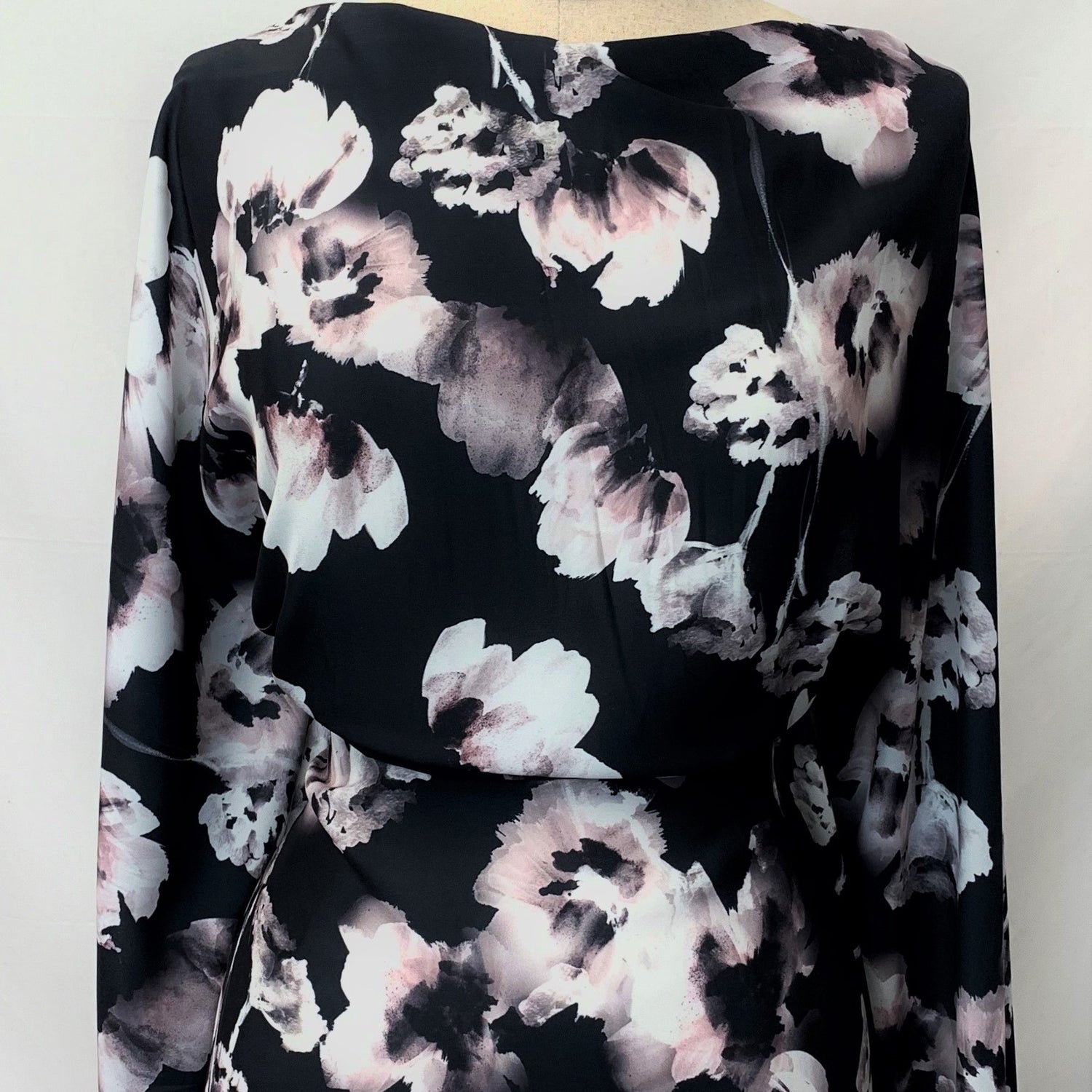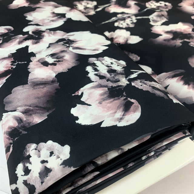 This beautiful, slinky satin fabric has a nude and cream floral print on a charcoal black background. This is ideal for stunning tops, blouses, skirts and dresses.