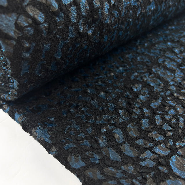 This loosely woven fabric is made from a blend of polyester and spandex; it has a textured finish almost like a boucle, featuring an abstract blue overlay pattern that shimmers in certain light. On top of this is a black small scale leopard print, adding even more interest, dimension and depth.