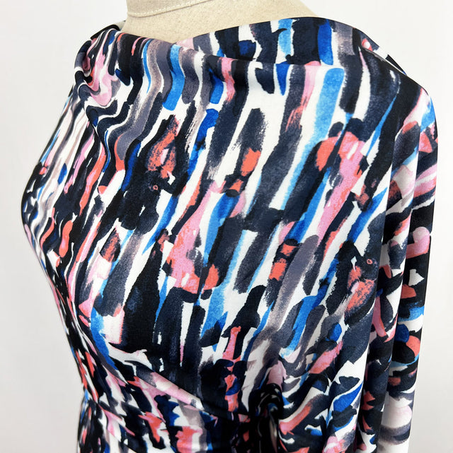 Easy Draping ITY jersey in a coral, blue, black and white abstract design.