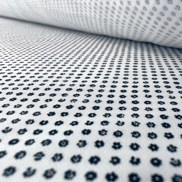 This delightful white cotton shirting fabric features a tiny heather-like flower print in contrasting dark navy. This unique fabric is perfect for sewing stylish looking shirts or a classy summer dress.