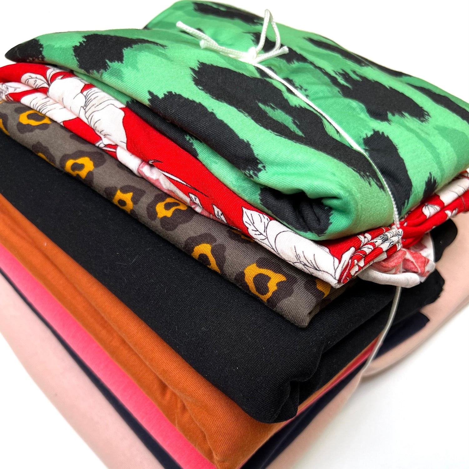 5.75m mixed bundle pack, 8 pieces of jersey fabric, ranging from 40cm to 90cm fabric pieces. Made up from deadstock fabrics, end of line cloths, and special one-off pieces.