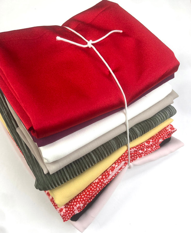 5.5m mixed bundle pack, 9 pieces of dress fabrics, ranging from 50cm to 92cm fabric pieces. Made up from deadstock fabrics, end of line cloths, and special one-off pieces.