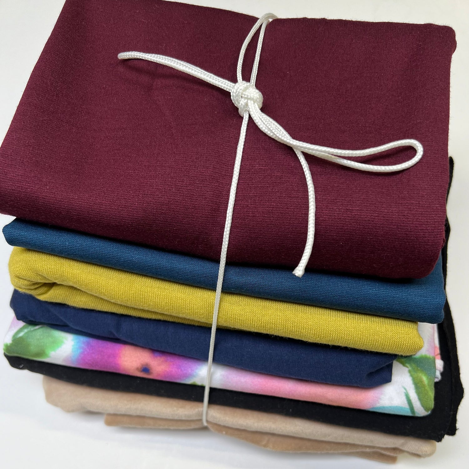 3.75m mixed bundle pack, 7 pieces of jersey fabric, ranging from 25cm to 1m fabric pieces. Made up from deadstock fabrics, end of line cloths, and special one-off pieces.
