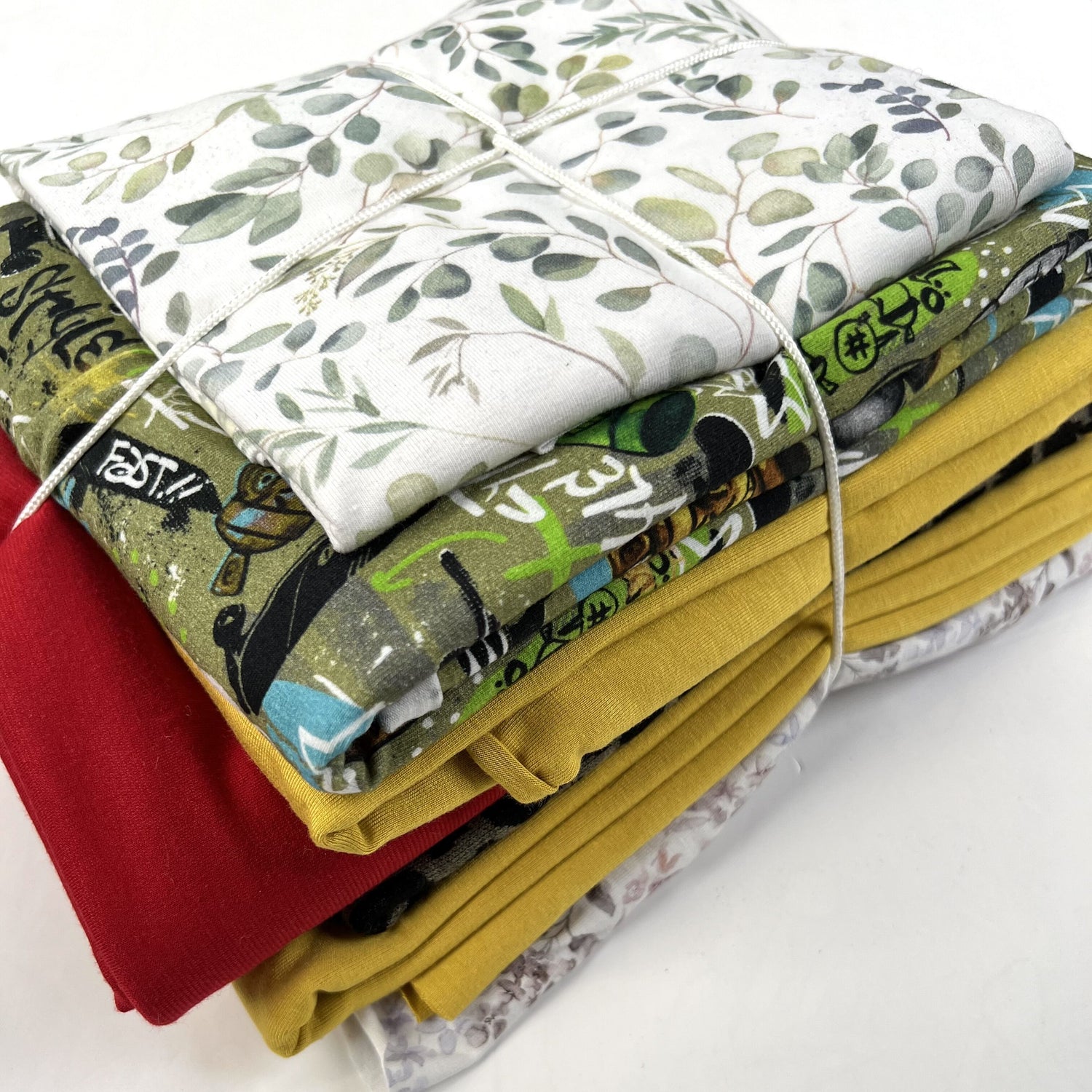 4.81m mixed bundle pack, 7 pieces of jersey fabric, ranging from 45cm - 1.12m fabric pieces. Great value!