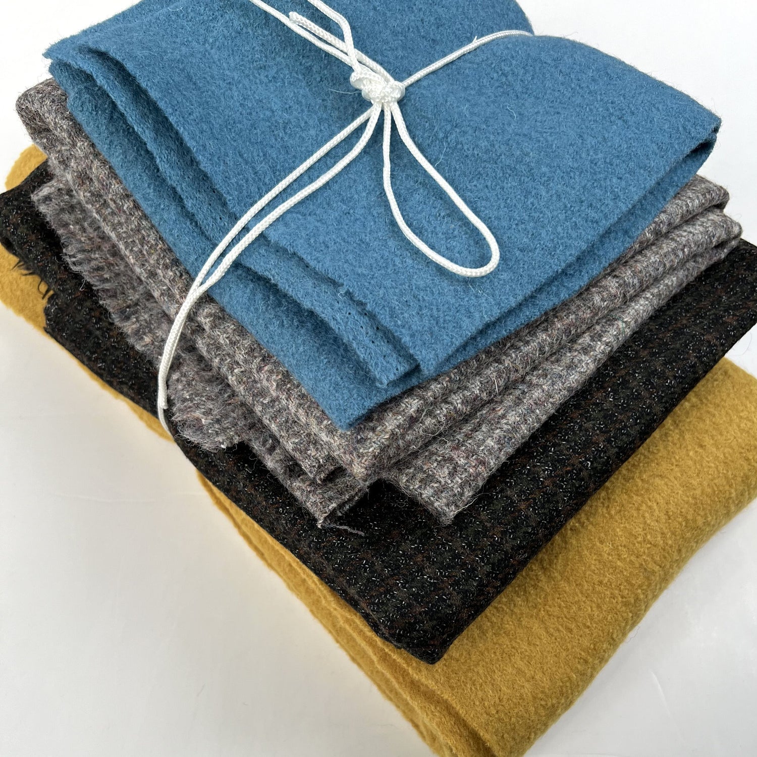 2.82m mixed colours boiled wool pack, 5 pieces of 100% wool fabrics, ranging from 17cm to 75cm pieces. Great value! Made up from deadstock fabrics, end of line cloths, and special one-off pieces.