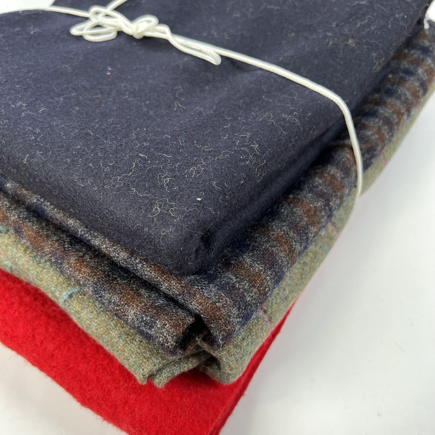 3.23m mixed wool pack, 4 pieces of 100% wool fabrics, ranging from 48cm to 1m pieces. Great value! Made up from deadstock fabrics, end of line cloths, and special one-off pieces.