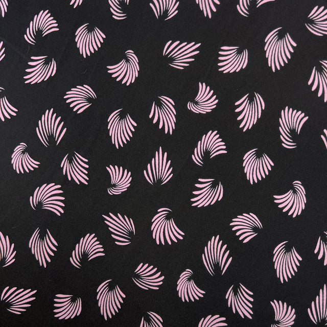 Black satin dressmaking fabric featuring a pink abstract ‘fan tail’ design, perfect for blouses, party wear or shirts!