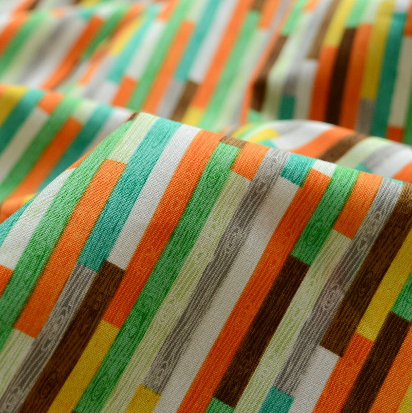 This is a lovely cotton fabric with a sort of vivid green, white, orange, yellow and brown wooden floorboard design! Perfect for making childhood quilts!