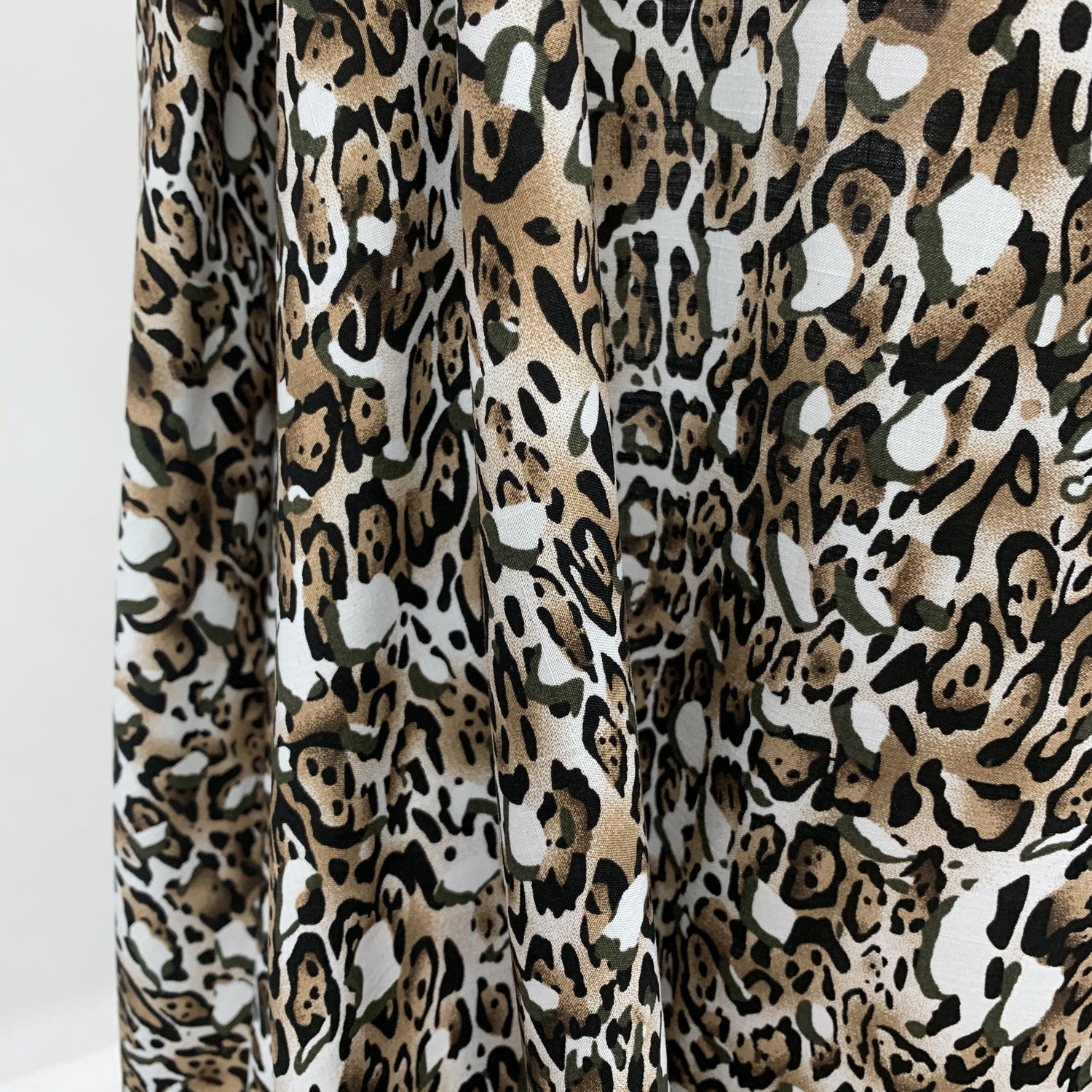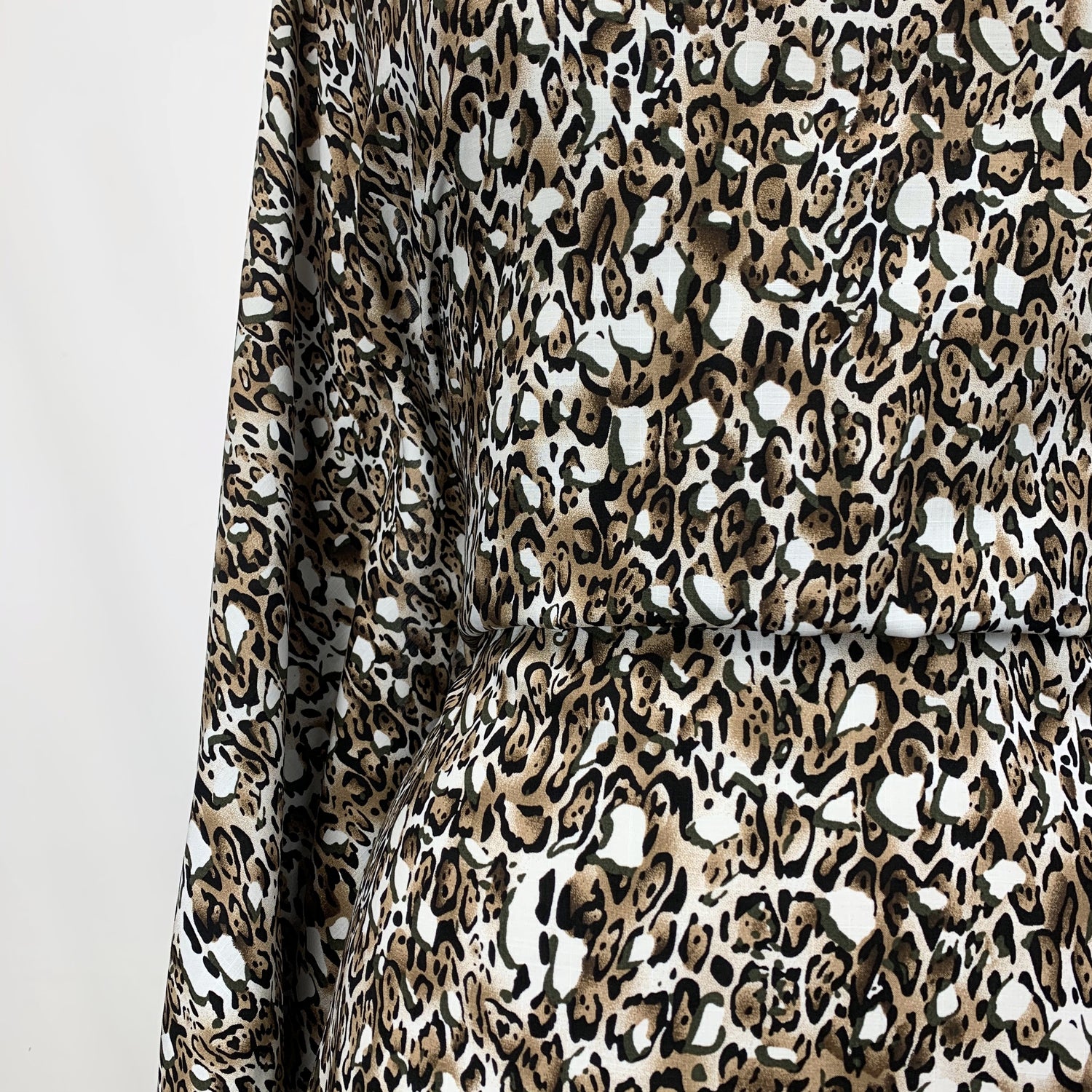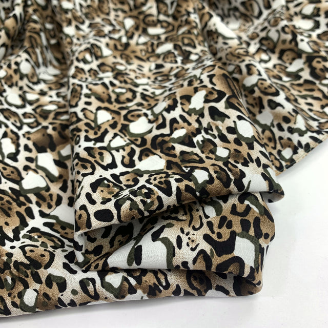 145cm wide, lightweight viscose challis dress fabric with a abstract cheetah design. Breathable, easy-care, and ideal for shirts and dresses with lovely drape.