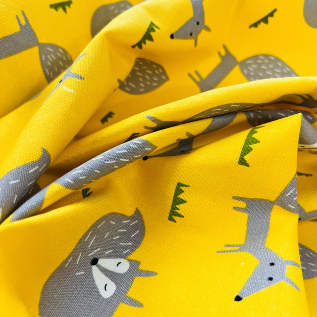 This vibrant yellow printed cotton canvas fabric showcases a super cute fox print. This little fox switches between sleeping and adventuring, who knows what else he’s up to.