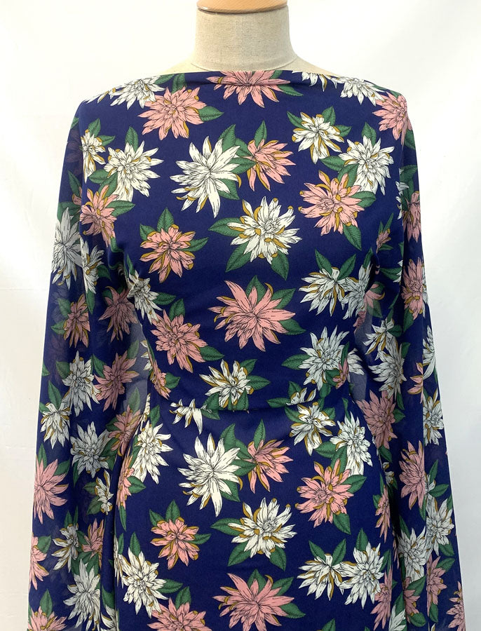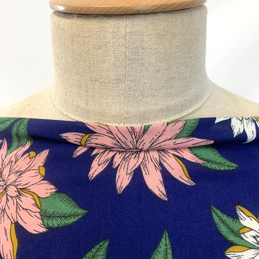 | 156cm wide, royal blue polyester fabric with an all over floral design in pink, green and ochre. | |