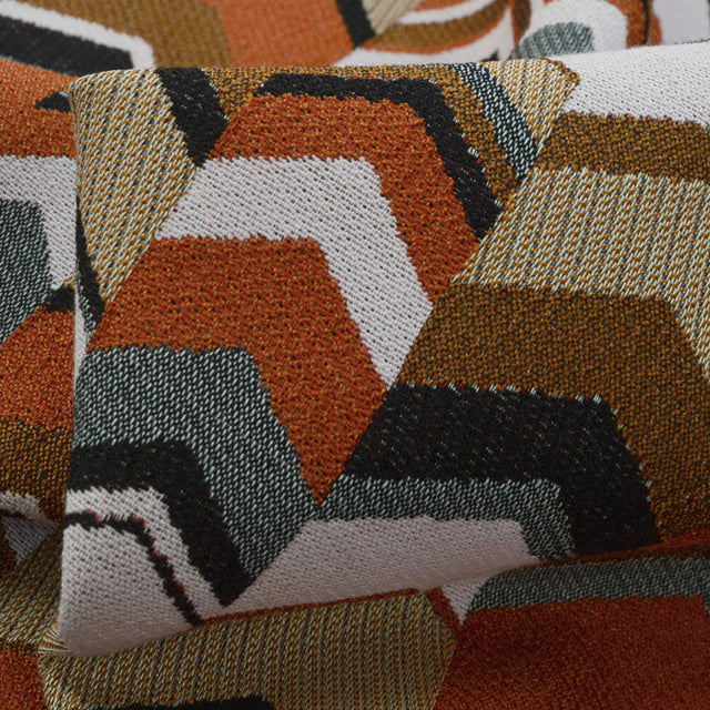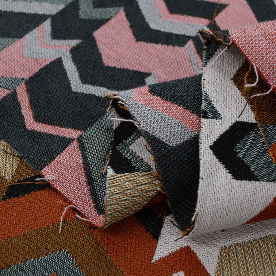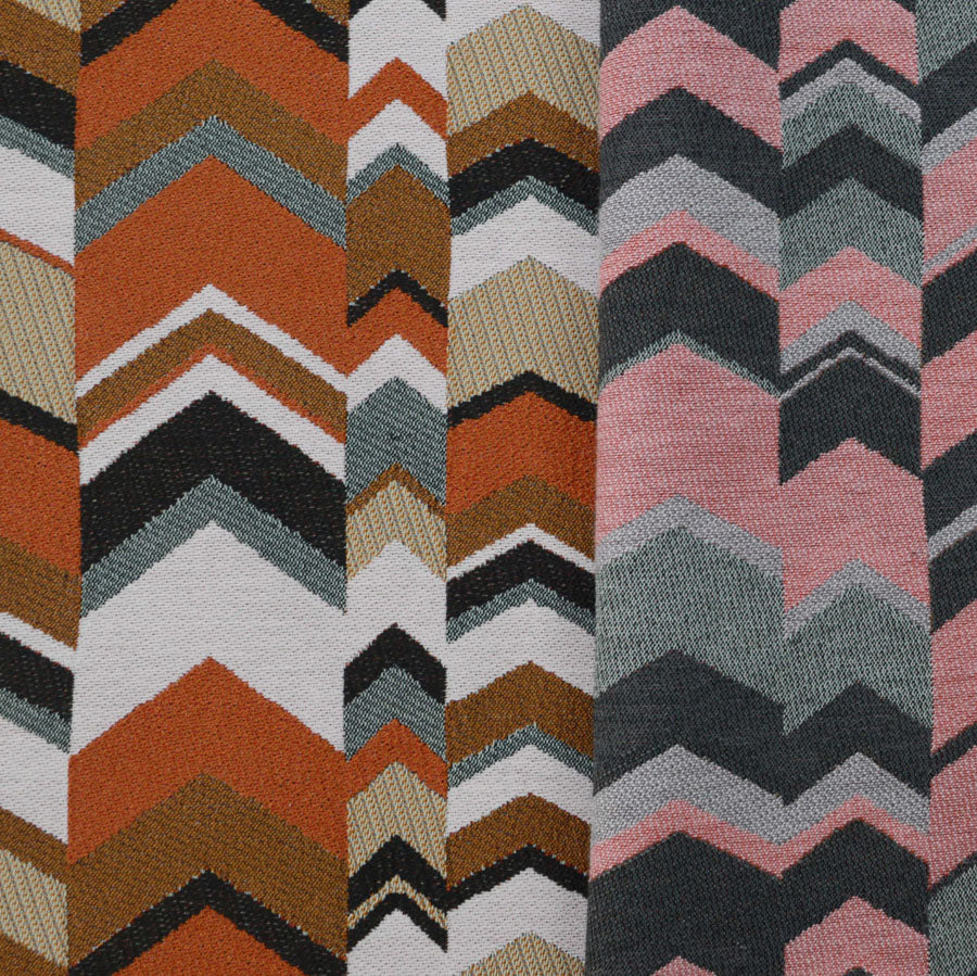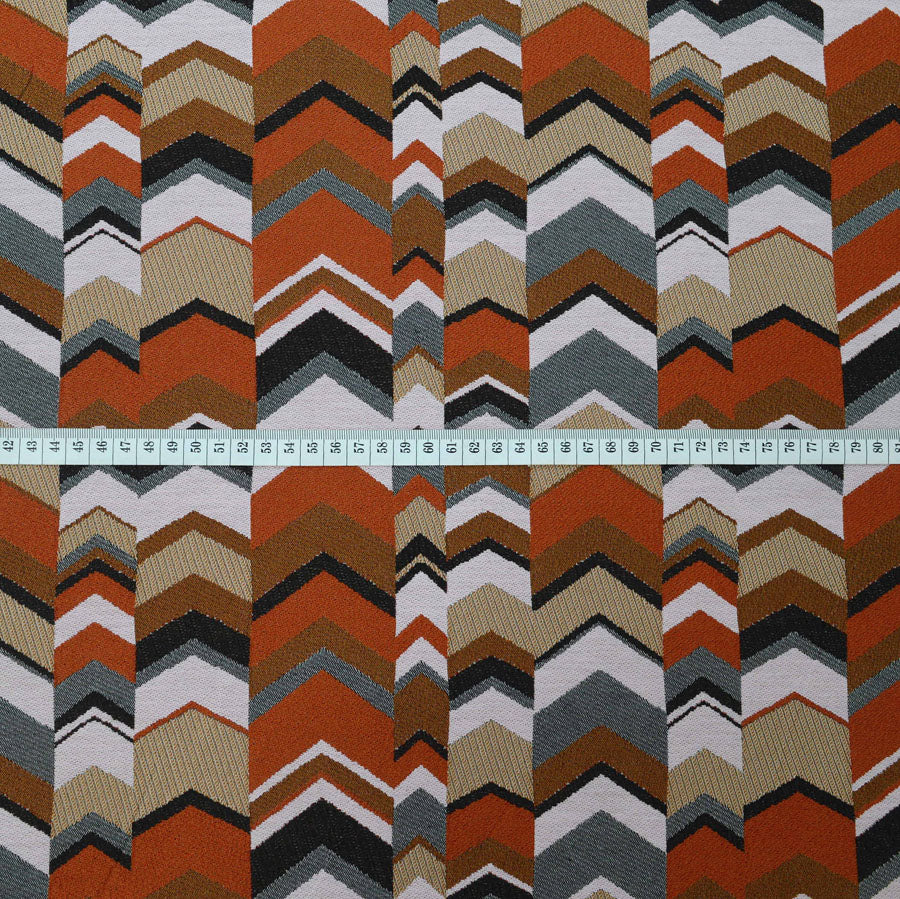 Polyester tapestry in a chevron stripe design with the chevrons being all different sizes, and the stripes being different widths, the colours involved are rust, very pale pink, black, grey, dark russet Brown and beige – beautifully made and quite eye catching. This Would make a structured skirt, memorable jacket and it is also good for bags.