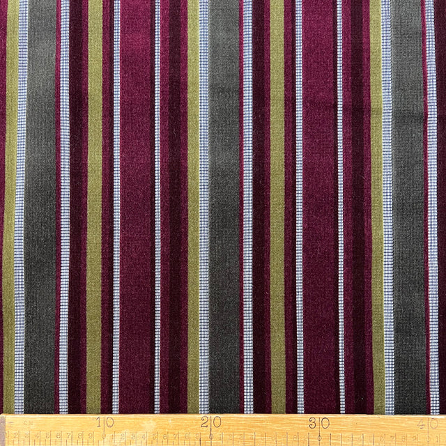 Made from a blend of acrylic, polyester, viscose and kanecaron, this striped furnishing fabric in burgundy is great for upholstery.