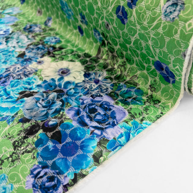 Introducing our stunning Italian 134cm wide 'double' cotton fabric with a luxurious satin finish. This unique fabric features a captivating large floral design in various shades of blue on a lush green background. Crafted with meticulous attention to detail, this fabric boasts a distinctive 'double' construction. The face showcases the ornate floral pattern, beautifully interwoven in blue hues, and a raised soft satin circle pattern. While the white cheesecloth backing provides a delicate contrast to the vibrant floral face. The combination of these two layers results in a fabric that is not only visually striking but also delightfully textured.