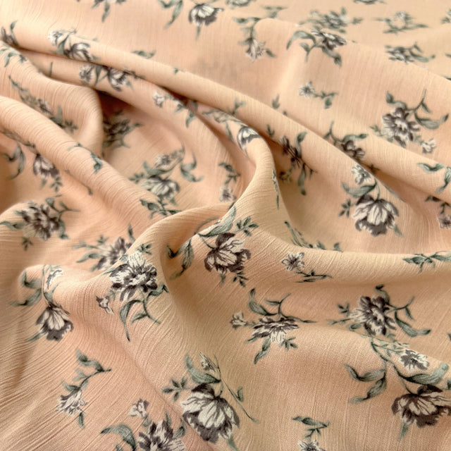 Featuring a delicate floral print in enchanting shades of peach, mauve, green, and white, this fabric boasts a subtle textured barely pleated viscose lawn that gracefully drapes. The breathability of this fabric makes it a fab choice for creating stylish summer dresses, blouses, and skirts. We also have this fabric in Grey.