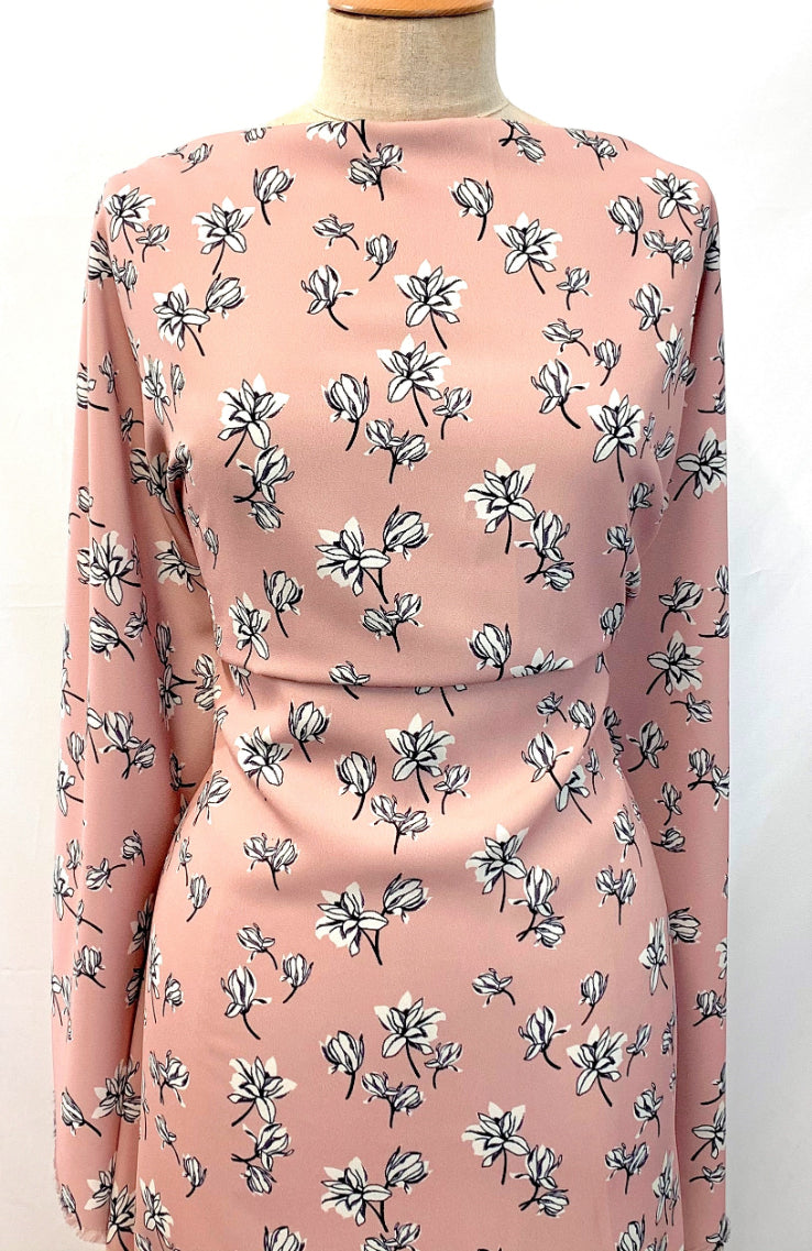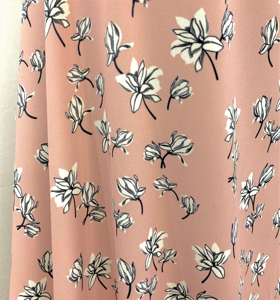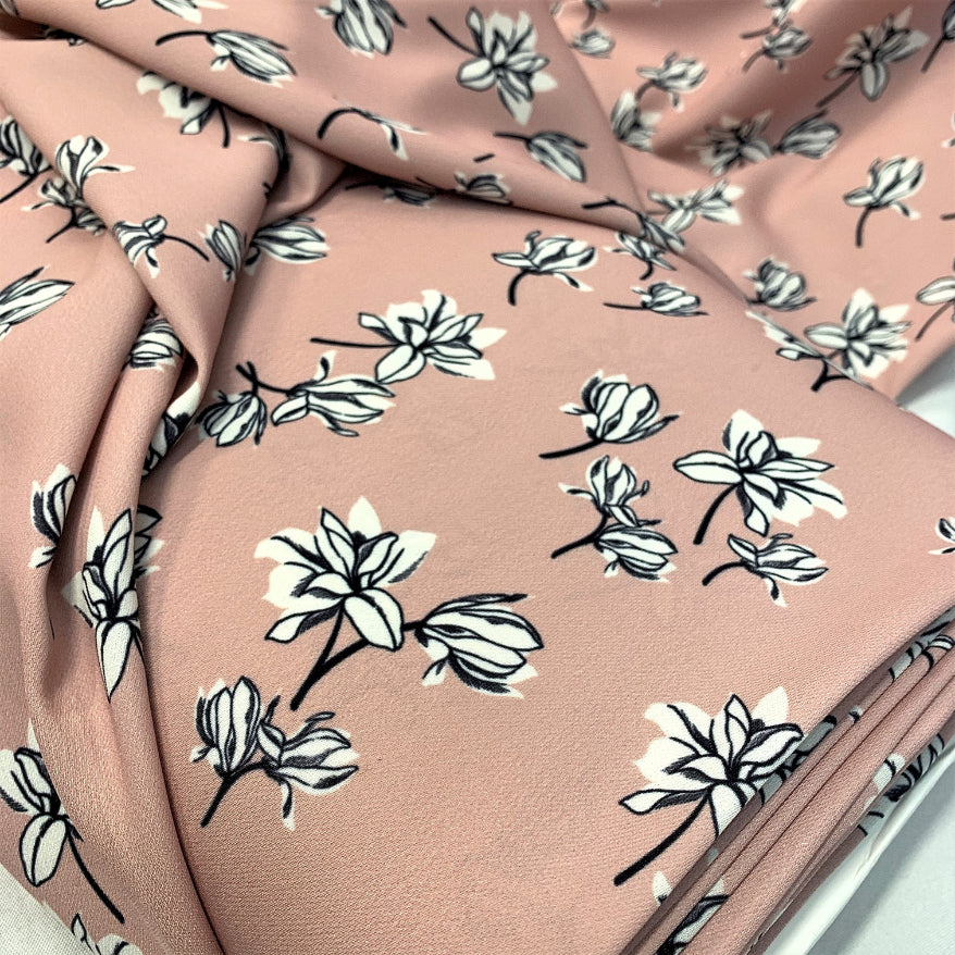 This incredibly soft and drapey, medium weight 100% polyester crepe fabric. With an all over black and white magnolias fowers design on blush/nude coloured ground. This is as you would expect from John Kaldor the best quality and will be a dream to sew and wear.