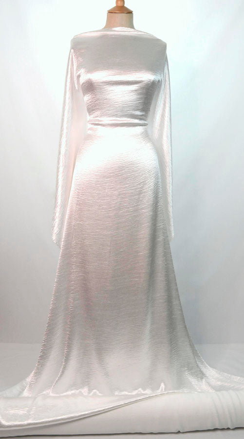 160 cm wide ivory softly woven polyester satin beautifully soft blouse and dress fabric which has been given a ripple effect surface and a finish which shines. Enough of it would be beautiful, too much might be a little bit ghostly. |