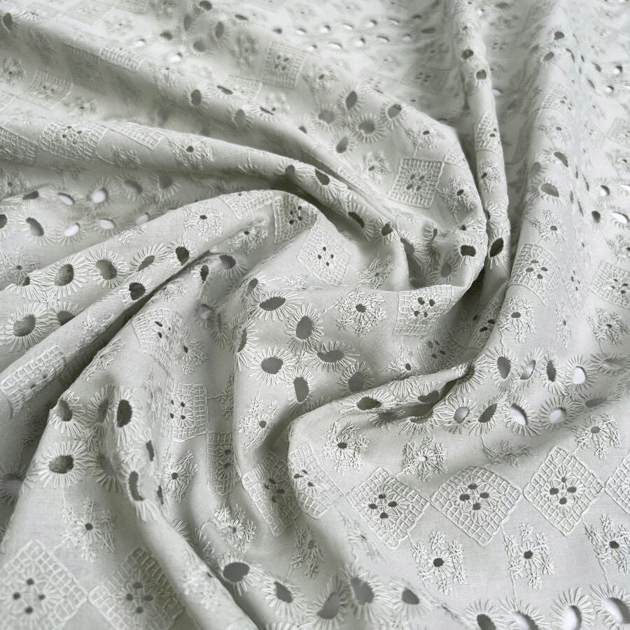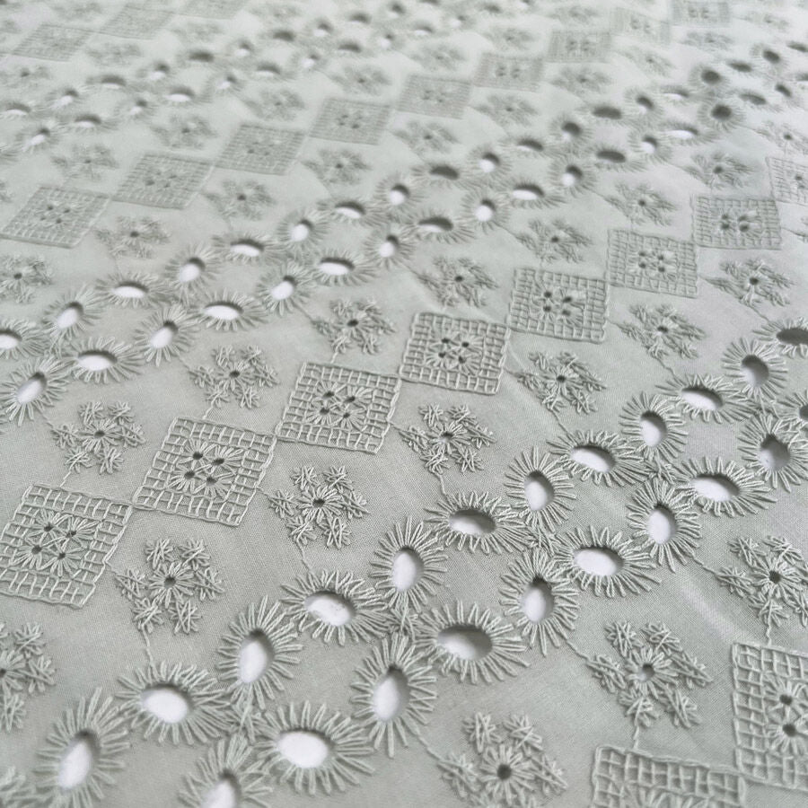 Delicate and timeless, this sage green broderie anglaise fabric is perfect for creating soft, romantic garments. Made from 100% cotton, it’s breathable and comfortable with beautiful embroidered eyelet detailing throughout. At 140cm wide and 133gsm, it’s lightweight with a gentle drape—ideal for blouses, dresses, skirts, and childrenswear that capture an effortless, summery charm.