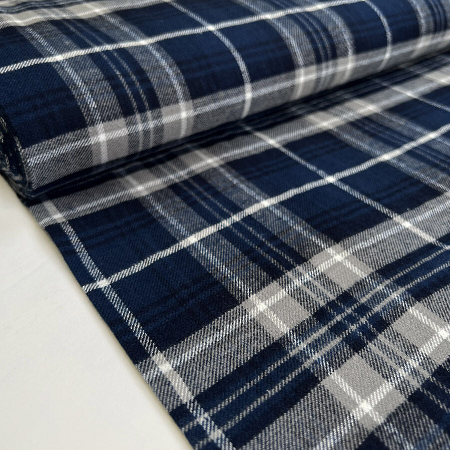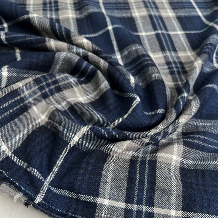 Soft, warm, and effortlessly timeless, this navy, grey, and white brushed cotton check fabric is perfect for cosy, breathable makes. Woven from cotton and brushed on one side for extra softness, it feels gentle against the skin while remaining light and comfortable. At 144cm wide and 140gsm, it’s easy to sew and ideal for shirts, pyjamas, dresses, and childrenswear. Certified to OEKO-Tex Standard 100, it’s safe, sustainable, and perfect for everyday wear.