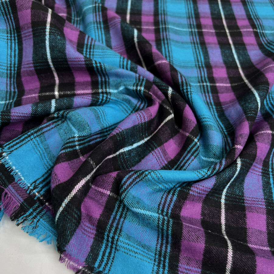 Soft, cosy, and full of personality, this turquoise, purple, and black brushed cotton check fabric is perfect for creating comfortable everyday garments. Woven from cotton and brushed for extra softness, it feels warm and gentle against the skin while remaining breathable and easy to work with. At 144cm wide and 140gsm, it’s ideal for shirts, pyjamas, dresses, and childrenswear. Certified to OEKO-Tex Standard 100, it’s a safe, sustainable, and stylish choice.
