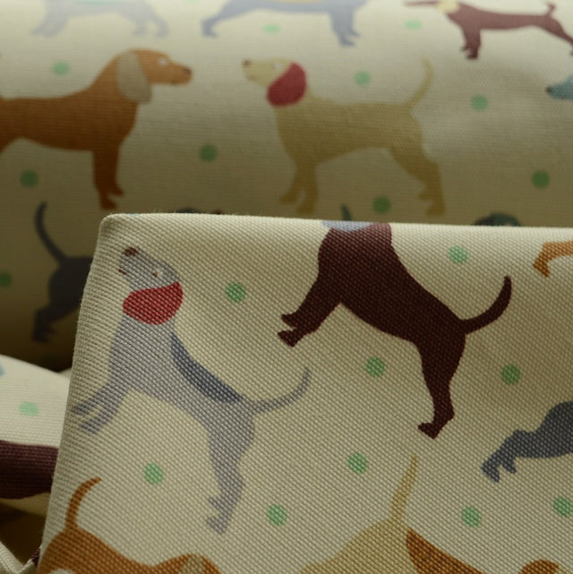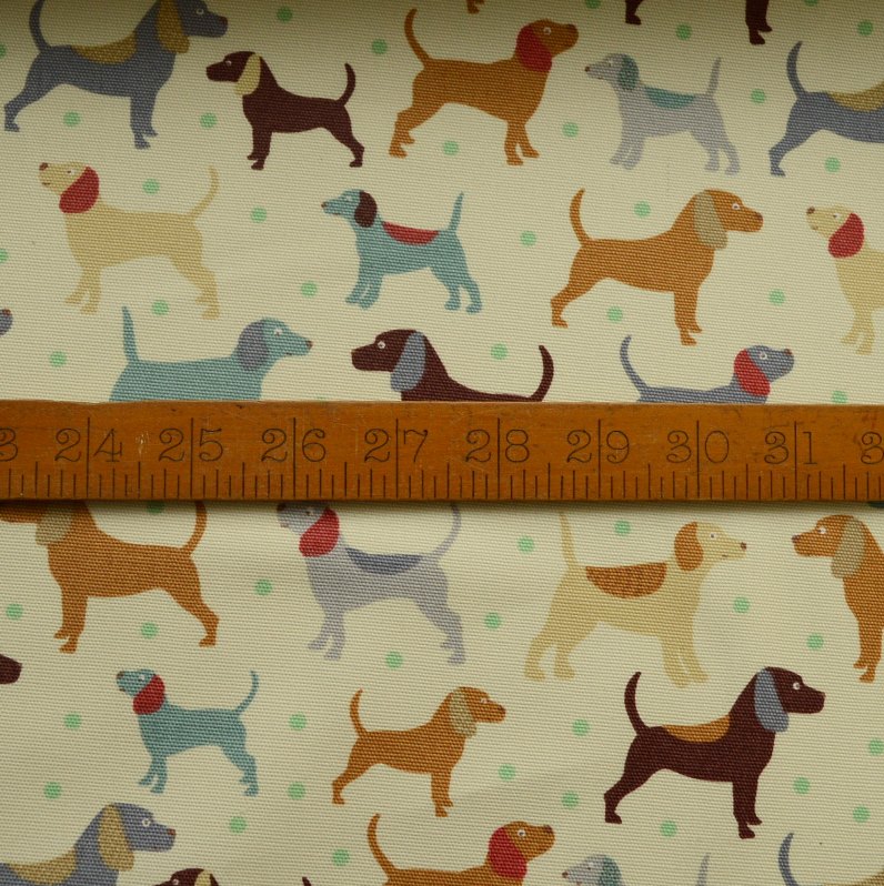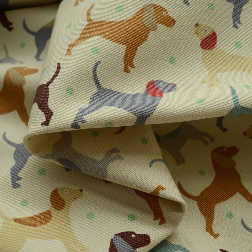 A 150cm wide soft very light beige cotton canvas, with an all over print of small green spots and dogs of slightly varying shapes and sizes. The spots are an almost apple green. While the dogs come in tan, grey, duck egg blue, medium beige and dark browny-red.