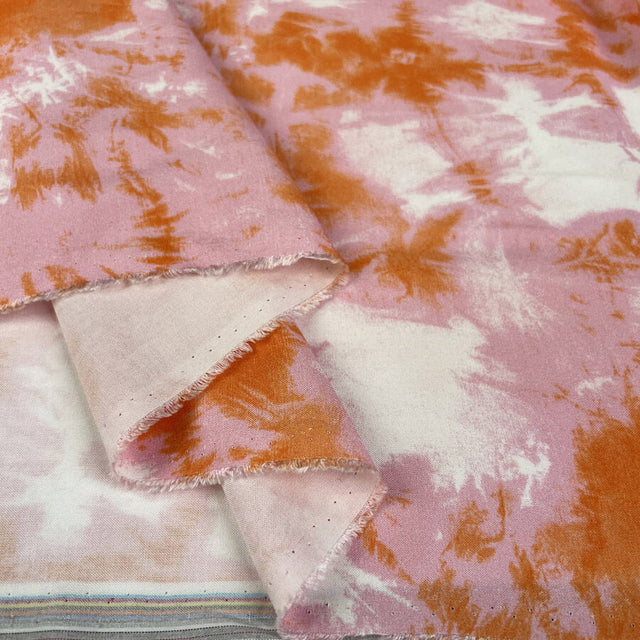 A lightweight printed viscose, 125cm wide and 125gsm, with a soft handle and fluid drape. The design features a bold tie-dye effect in vivid orange and soft pink, creating a playful and summery look. Breathable and comfortable to wear, this cloth is perfect for stand-out warm-weather garments.