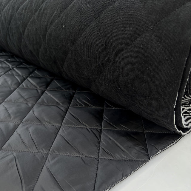 140cm wide, reversible quilting fabric in black with a soft-touch knitted corduroy side made from 98% polyester and 2% elastane, paired with a smooth water-repellent 100% polyester reverse.