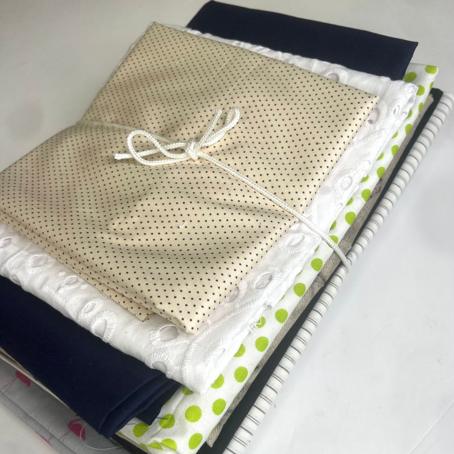 5.8m mixed bundle pack, 8 pieces of cotton, viscose and polyester fabric, ranging from 40cm to 90cm fabric pieces. Made up from deadstock fabrics, end of line cloths, and special one-off pieces.