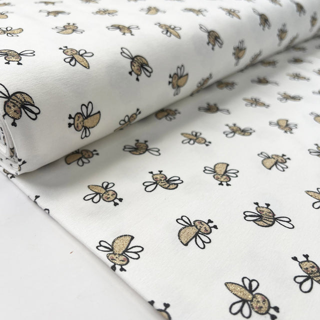 • 145cm wide, cotton & elastane knit jersey fabric in white with a black and gold glitter bee print.