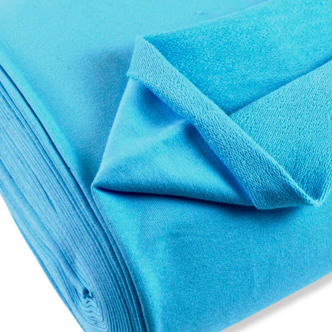 Introducing our 150cm wide, plain French Terry jersey fabric in aqua blue, designed with a looped back for added comfort and warmth. Crafted from a blend of 95% cotton and 5% elastane, it offers a comfortable stretch and a snug fit.