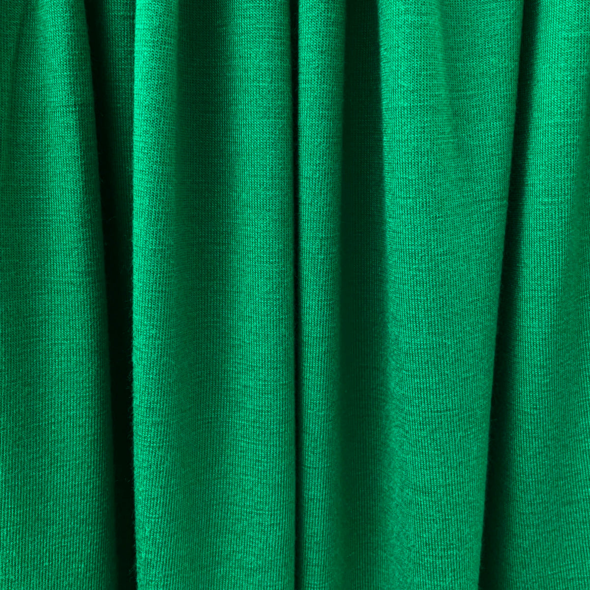 Fine knitted viscose elastane jersey material in a jade green. At approximately 200gsm this is a lightweight jersey so it is good for tops with lots of movement, a cowl neck for example. This is not a jersey for covering lumps & bumps but it is extrememly soft, has a good recovery and drapes beautifuly. |