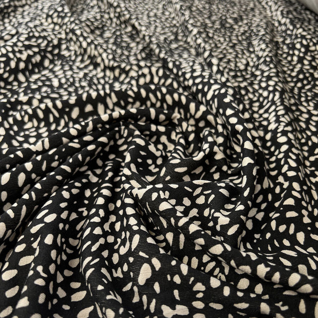 A soft and stretchy 150cm wide, jersey fabric with a abstract pebble design in black and beige.