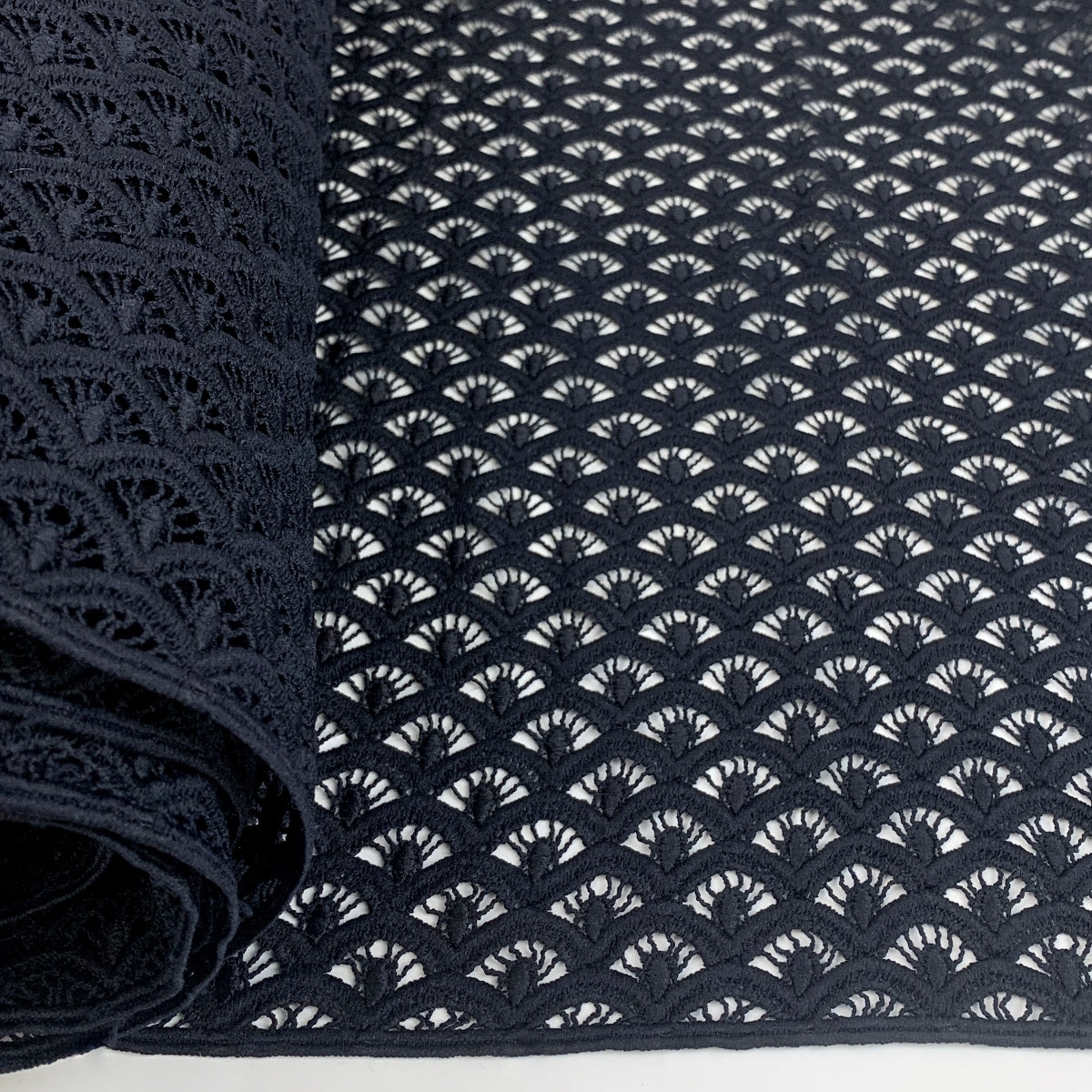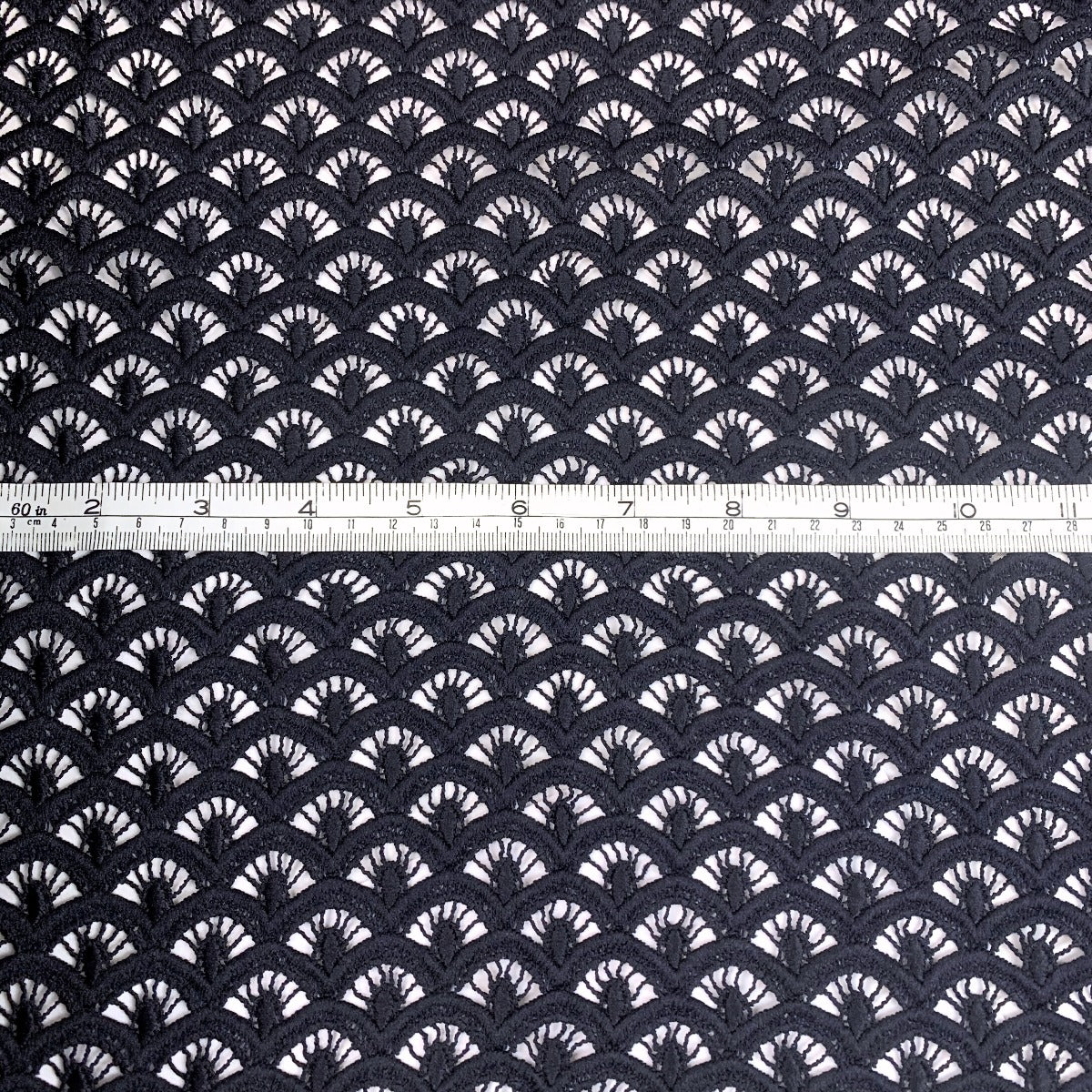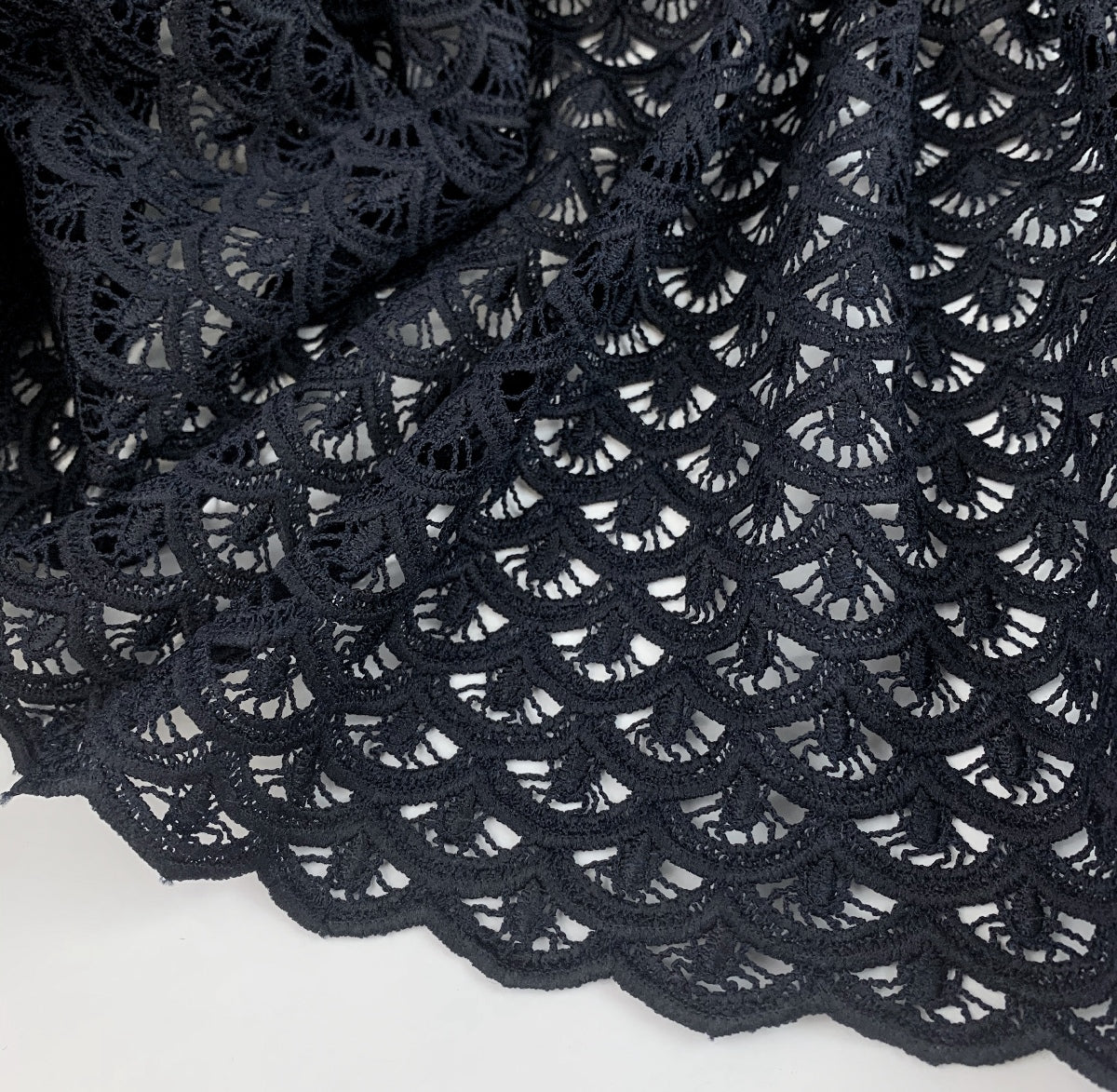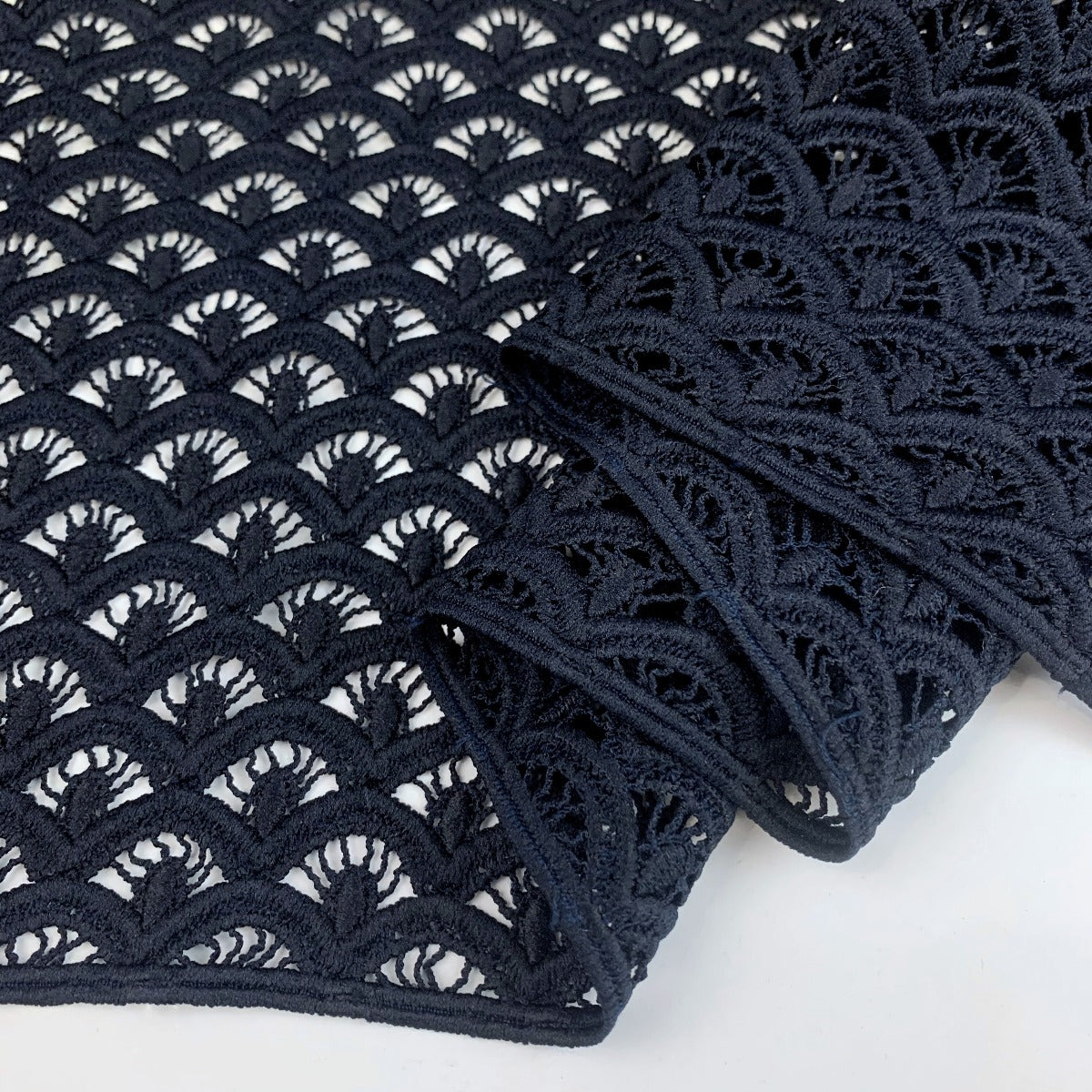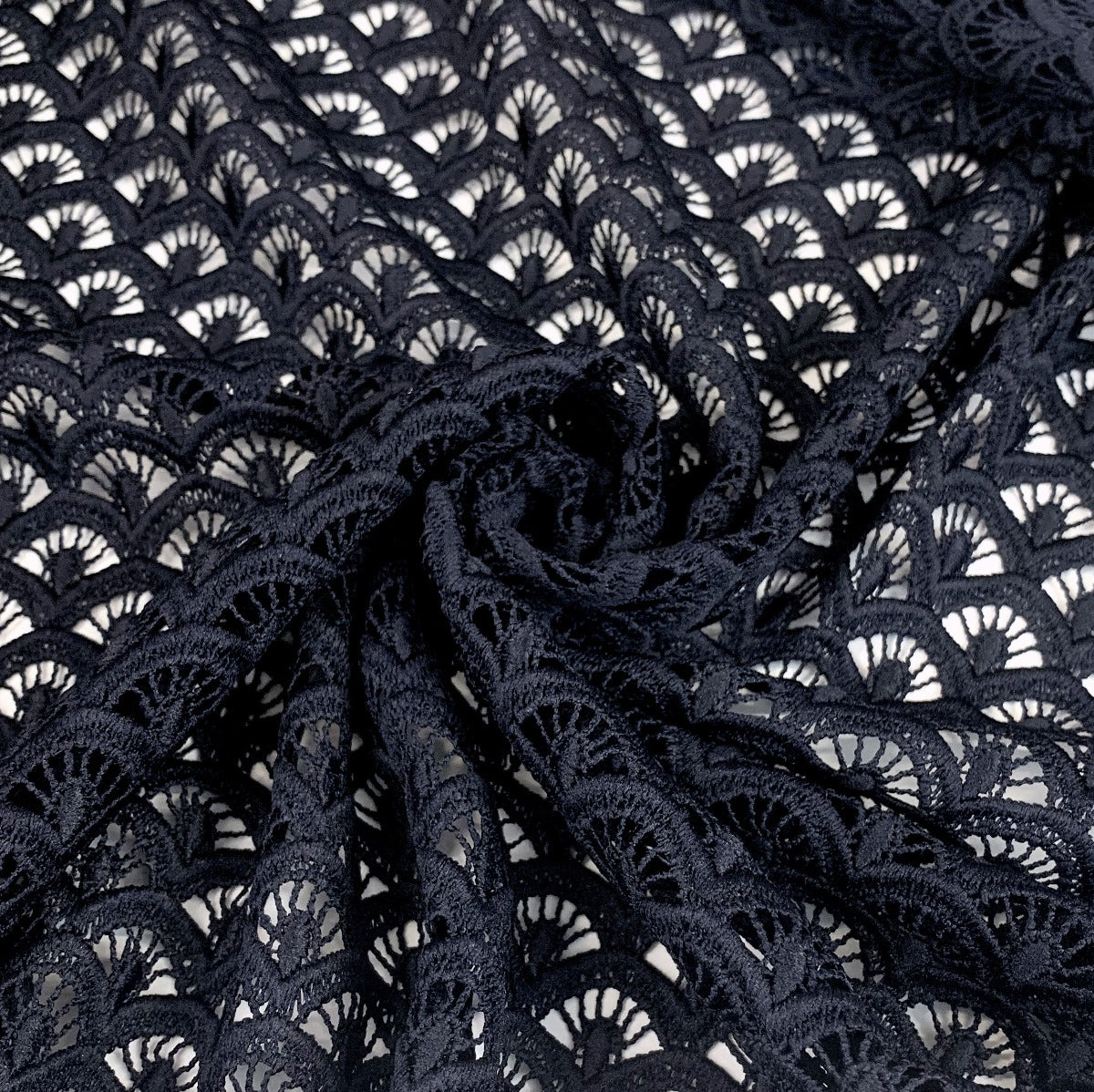 Stunning dark navy blue guipure lace fabric in a wonderful geometric design. Made from 100% polyester this comes in at 310 g/m² so a good weight, quite heavy. This will be beautiful for any special occasion. |