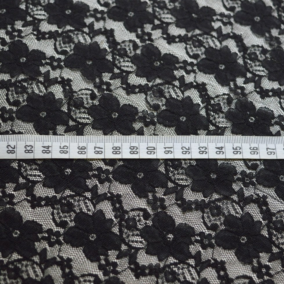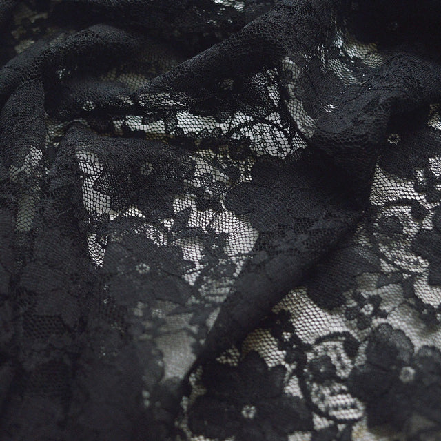 150cm wide floral polyester stretch lace for underwear and detailing. Lovely as a sleeve on a black dress or detailing on a satin camisole top. This can also be used as an overlay. |